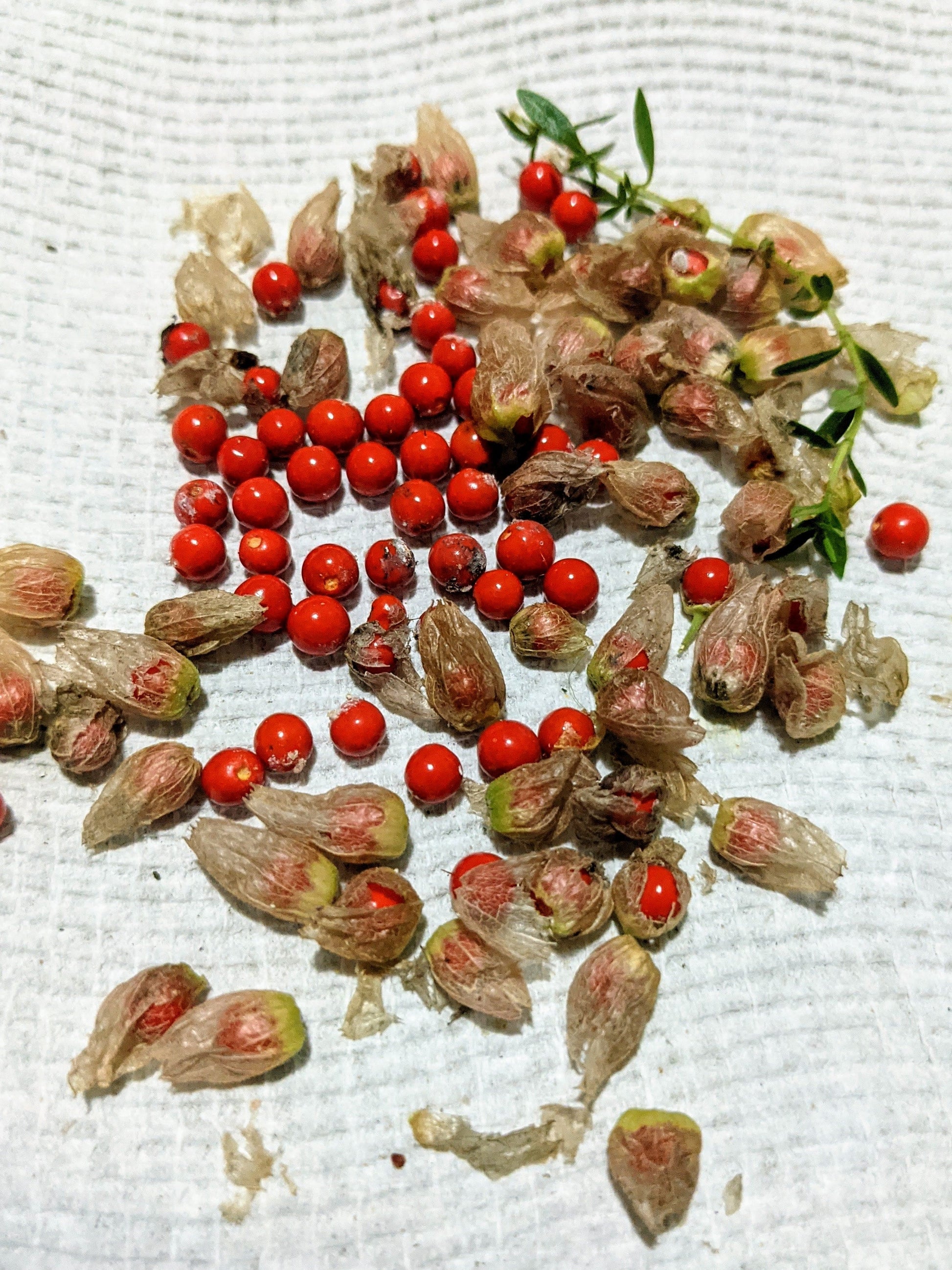 Withania somnifera is a small shrub growing up to 1 meter high and 75cm wide. The ovate leaves are about 8cm by 5cm at the widest point, tapering to the end. The central vein is prominent and the sides of the leaf fold in slightly towards the centre. The pale green flowers are held in an olive green calyx which surrounds the berry/fruit when the flower falls away, as the berry ripens the calyx browns and shrivels revealing the red fruit. Both the stem and leaves have a downy, grey sheen produced by a covering of tiny hairs. The fruit is a bright red and the seeds are tiny and brown.